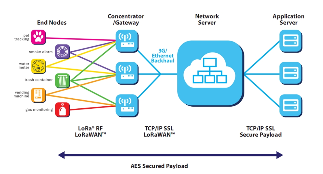 LoRaWAN astrorum topologiam adoptat. Terminatio machinis datas mittere ad servo network per portam, et deinceps ad schedulam suggestam.