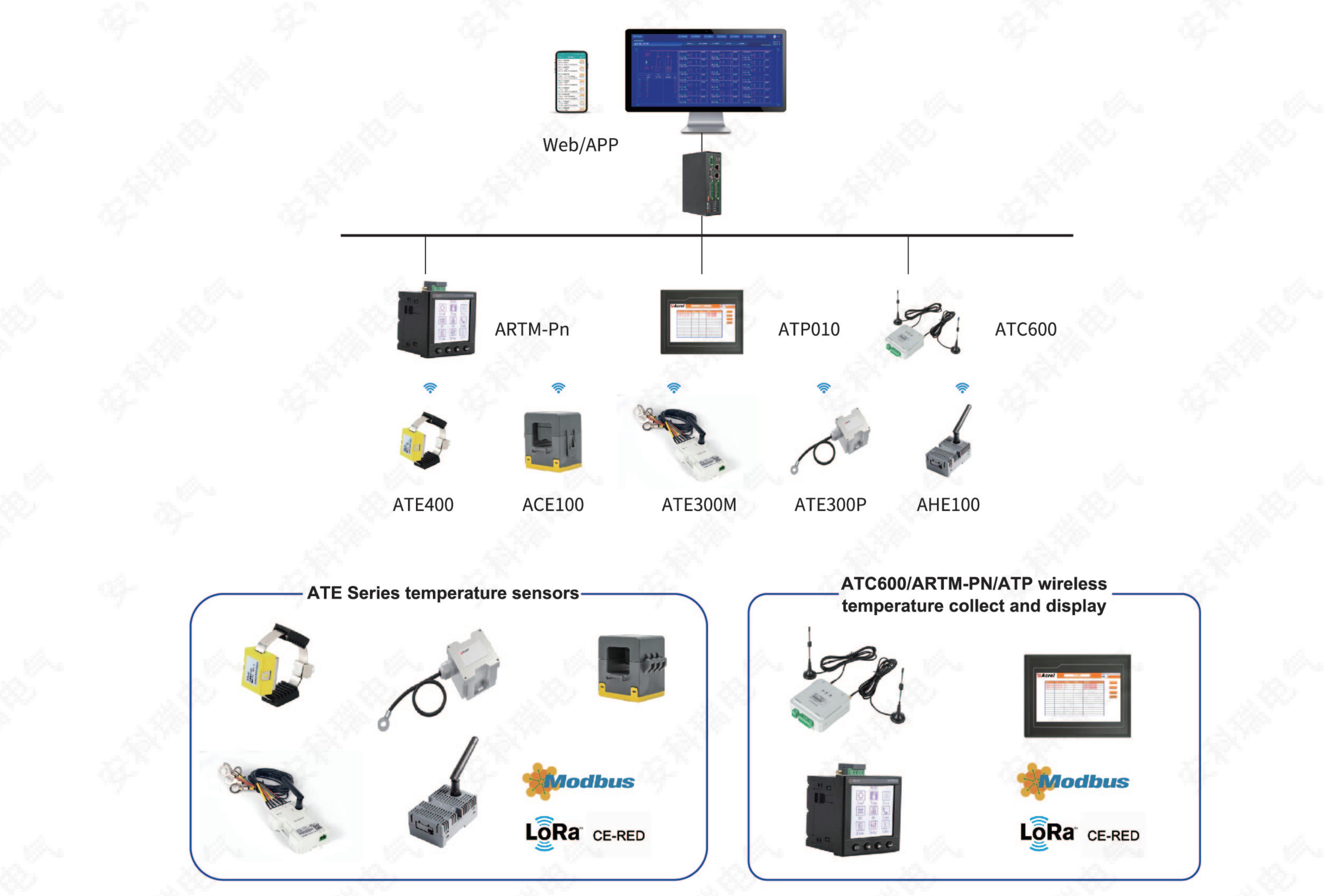 ATE series wireless temperaturae sensorem ordinatur ad real-time temperatura vigilantia in 3-35kV switchgears indoor quodque 0.4kV switchgears humilis-voltage. Potest in calefactionibus criticis inaugurari puncta, ut sunt funes compages, busbares, et contactus intra tabulas.